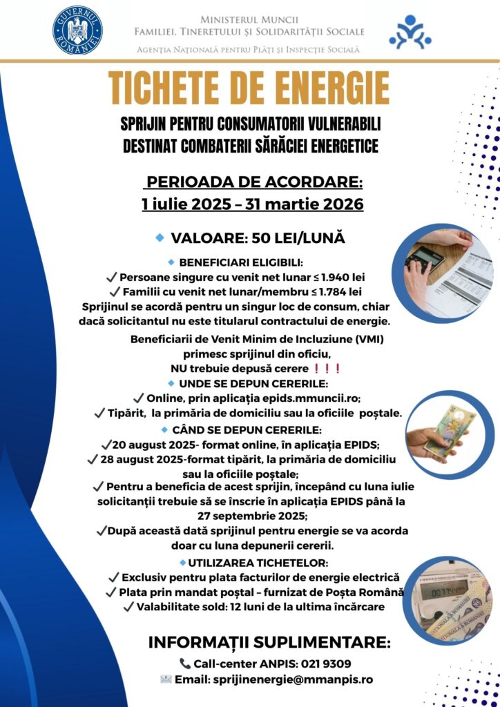 Consumatorii vulnerabili pot solicita, online, acordarea tichetului